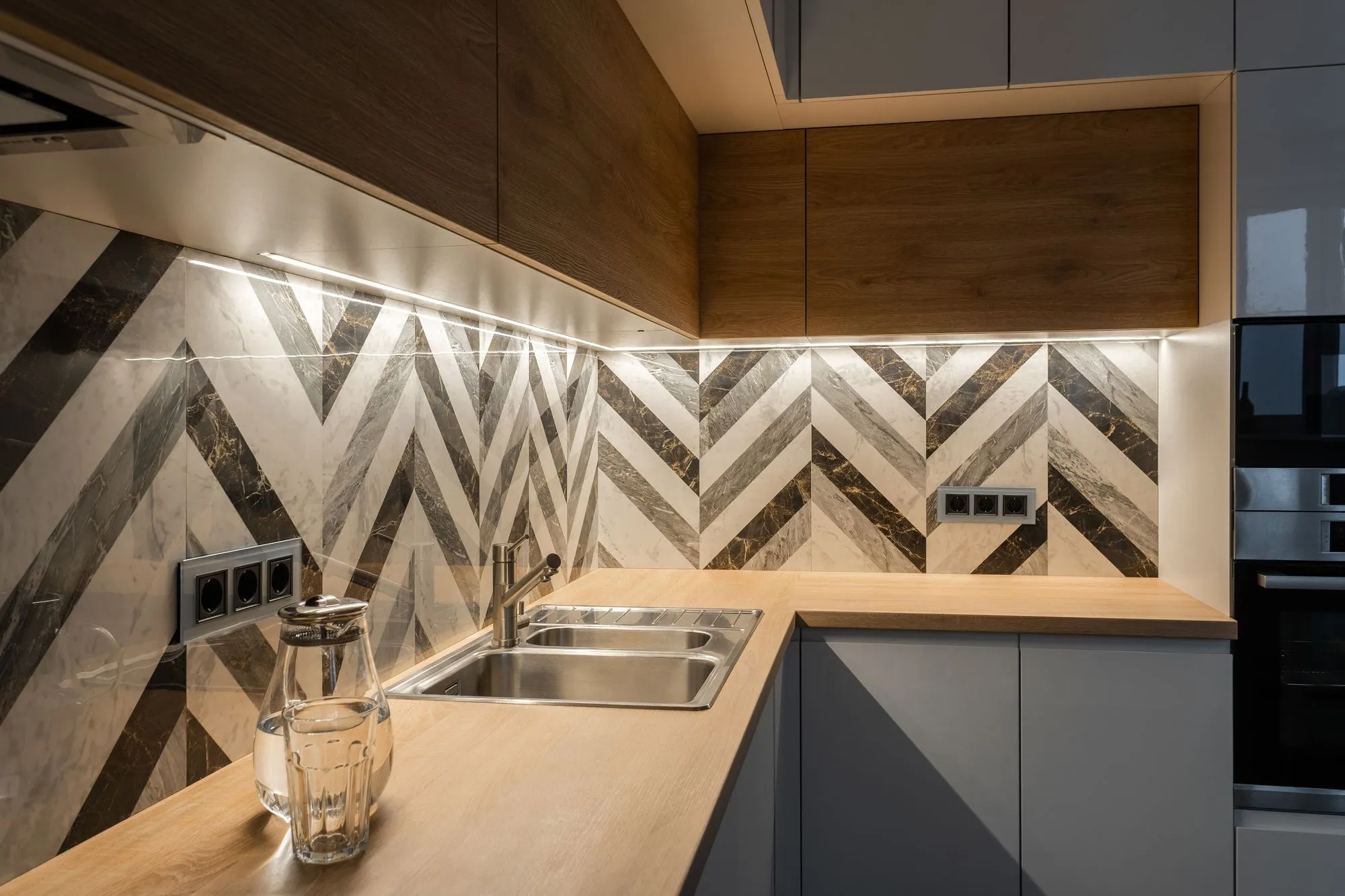 Такая же классика раскладка шеврон. Использование её в кухонном фартуке решает сразу несколько задач: